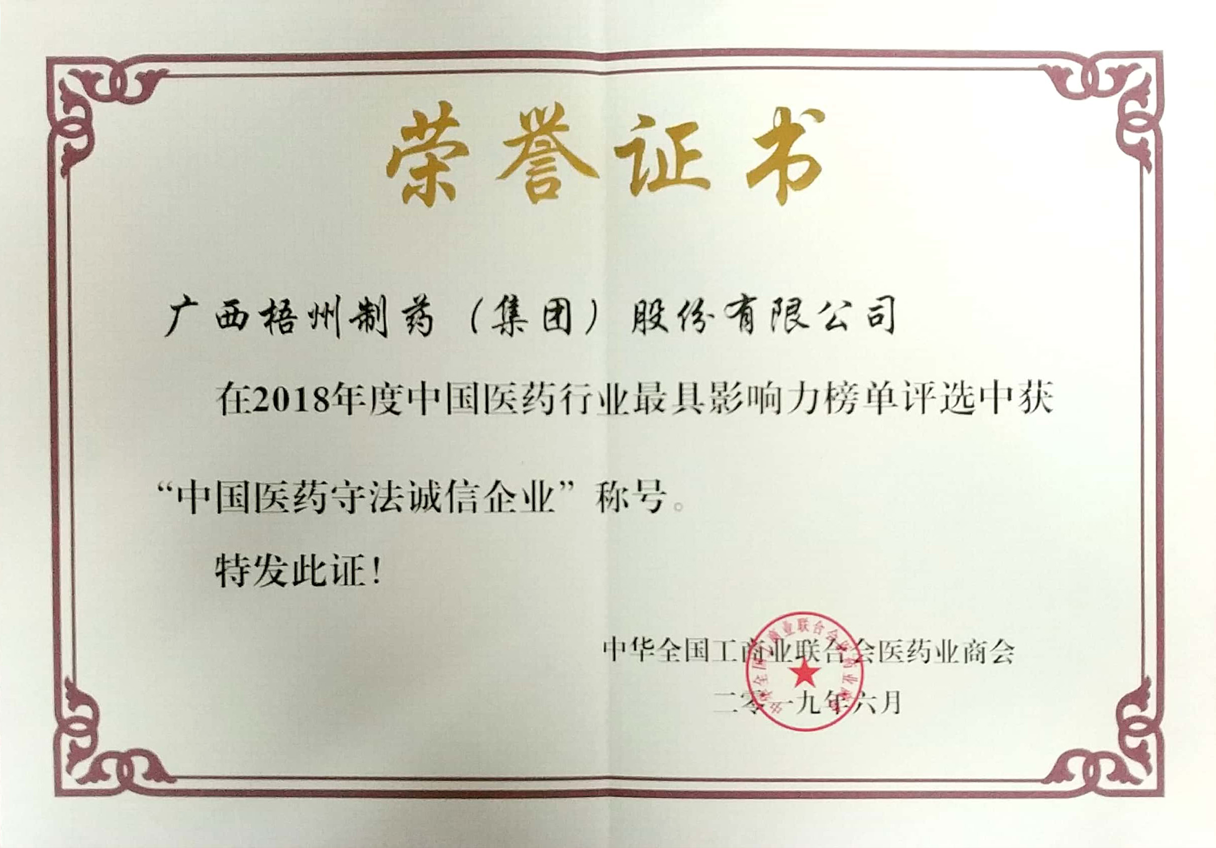 在2018年度中國醫(yī)藥行業(yè)最具影響力榜單評(píng)選中獲“中國醫(yī)藥守法誠信企業(yè)”稱號(hào)。