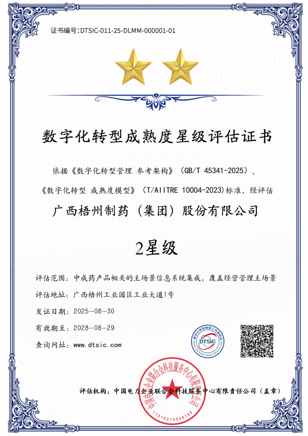 近日,數(shù)字化轉(zhuǎn)型貫標(biāo)工作委員會公布第十九批數(shù)字化轉(zhuǎn)型貫標(biāo)星級評估結(jié)果,廣西梧州制藥(集團)股份有限公司憑借扎實的轉(zhuǎn)型實踐與顯著成效,成功獲評數(shù)字化轉(zhuǎn)型成熟度2星級認證,成為中醫(yī)藥行業(yè)數(shù)字化轉(zhuǎn)型進程中的優(yōu)秀代表。該榮譽不僅是對企業(yè)過往轉(zhuǎn)型工作的權(quán)威認可,更為行業(yè)同仁推進數(shù)字化轉(zhuǎn)型提供了可參考的實踐路徑。