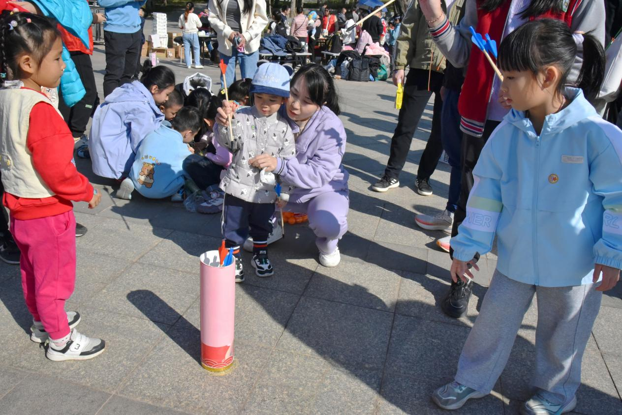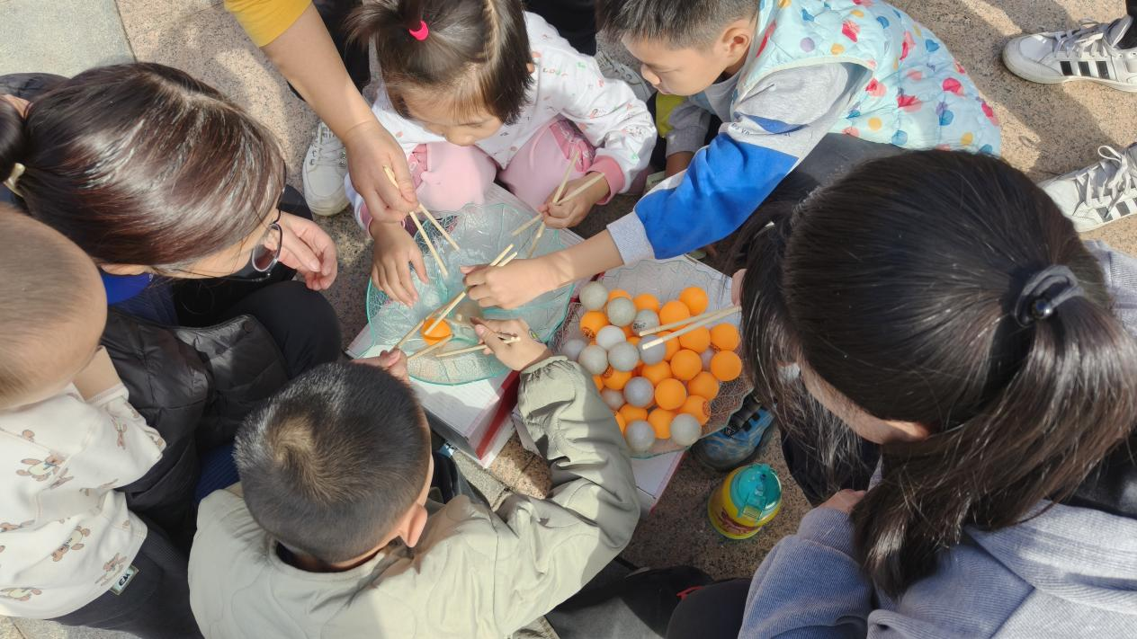 上午9時(shí)30分,活動(dòng)正式拉開(kāi)帷幕,一場(chǎng)場(chǎng)充滿趣味與溫情的親子游戲輪番上演?!爸樾腥f(wàn)里”項(xiàng)目中,家長(zhǎng)與孩子手持半圓槽拼接通道,小球滑落時(shí)共同默契重整,掌心相對(duì)間不僅傳遞著力量,更凝聚著親情;壺中“箭”寶環(huán)節(jié)融入傳統(tǒng)元素,家長(zhǎng)們手把手帶領(lǐng)孩子瞄準(zhǔn)投擲,每一次成功入壺都引發(fā)全場(chǎng)歡呼;“筷子夾乒乓球”項(xiàng)目磨練耐心技巧,孩子們模仿家長(zhǎng)動(dòng)作小心翼翼夾球,有的家庭還創(chuàng)意發(fā)明“接力夾球”玩法,現(xiàn)場(chǎng)加油聲、歡呼聲交織成群。